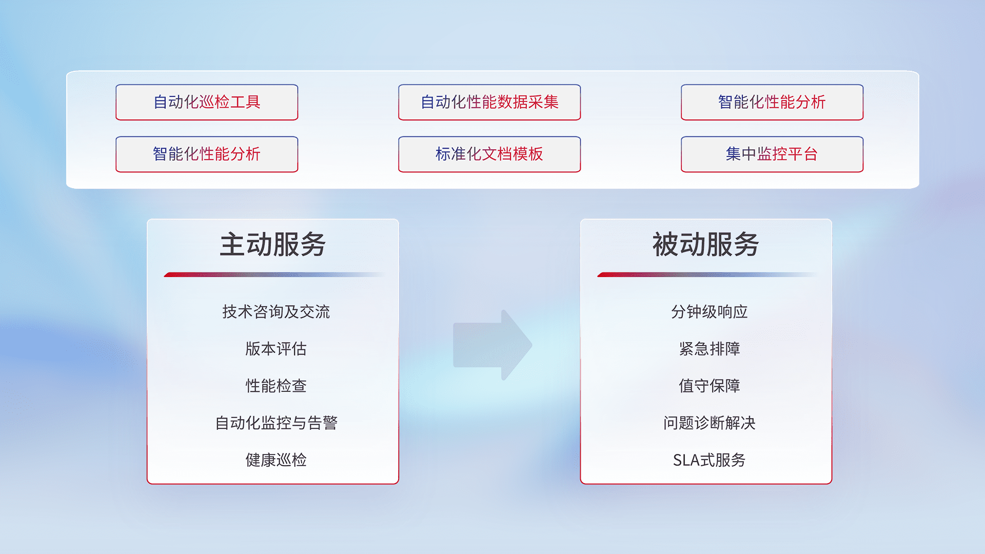 智能化工具和标准化文档,,保障服务质量,,,,提供主动服务(包含技术咨询、、、、版本评估、、、、性能检查、、自动化监控与告警、、健康巡检)和被动服务包含(分钟级响应、、紧急排障、、值守保障、、问题诊断解决、、SLA服务)。。。