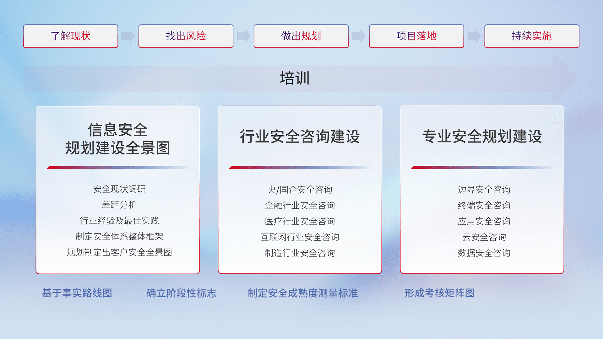 针对客户行业特性,,以专业的安全服务+多厂商联合解决方案提供专属的一站式安全管理服务,,帮助客户全面感知网络空间威胁,,基于识别、、、检测、、、分析、、、、防护、、监测、、、响应的服务理论模型,,,从方案咨询、、集成交付、、、、评估验证、、、、优化加固、、、、运维运营,,致力于为客户提供完整的闭环管理式安全服务。。。。以实战经验为客户打造高抵御风险的安全体系,,帮助客户发现威胁、、、对抗威胁、、处置威胁,,,,不断积累安全对抗能力,,,持续保障数字化安全。。