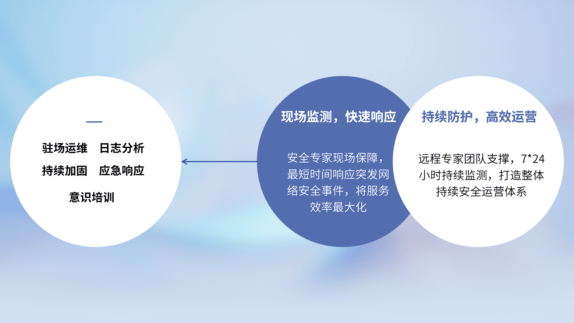针对客户行业特性,,提供专属的一站式安全管理服务,,,,帮助客户全面感知网络空间威胁,,,,通过安全专家的线上、、、、线下防护支持,,,实现风险闭环,,,,将安全保障常态化,,,,为客户打造常态化安全运维运营服务。。。